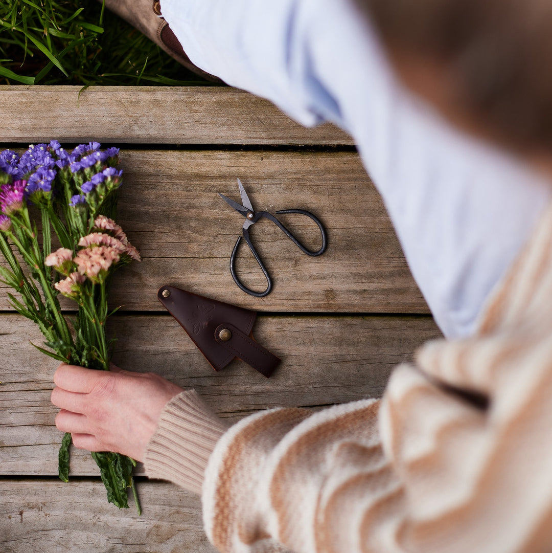 Small Vintage Flower + Herb Scissors with Recycled Leather Pouch